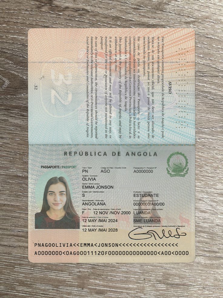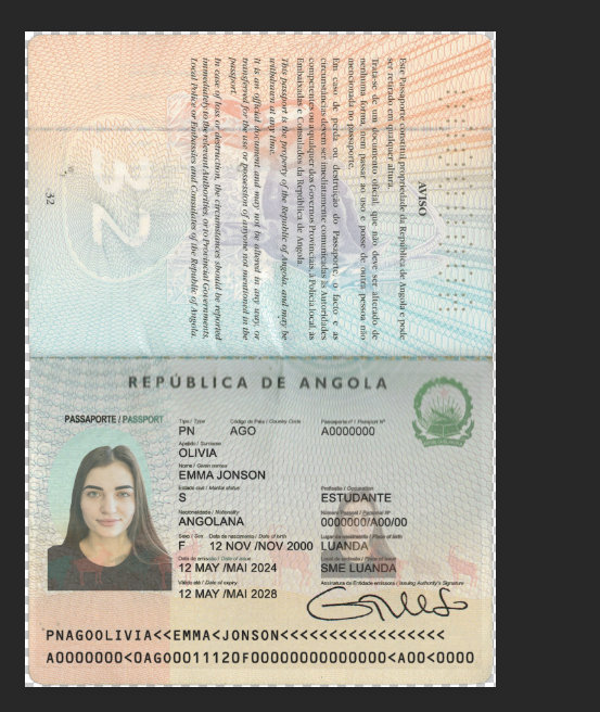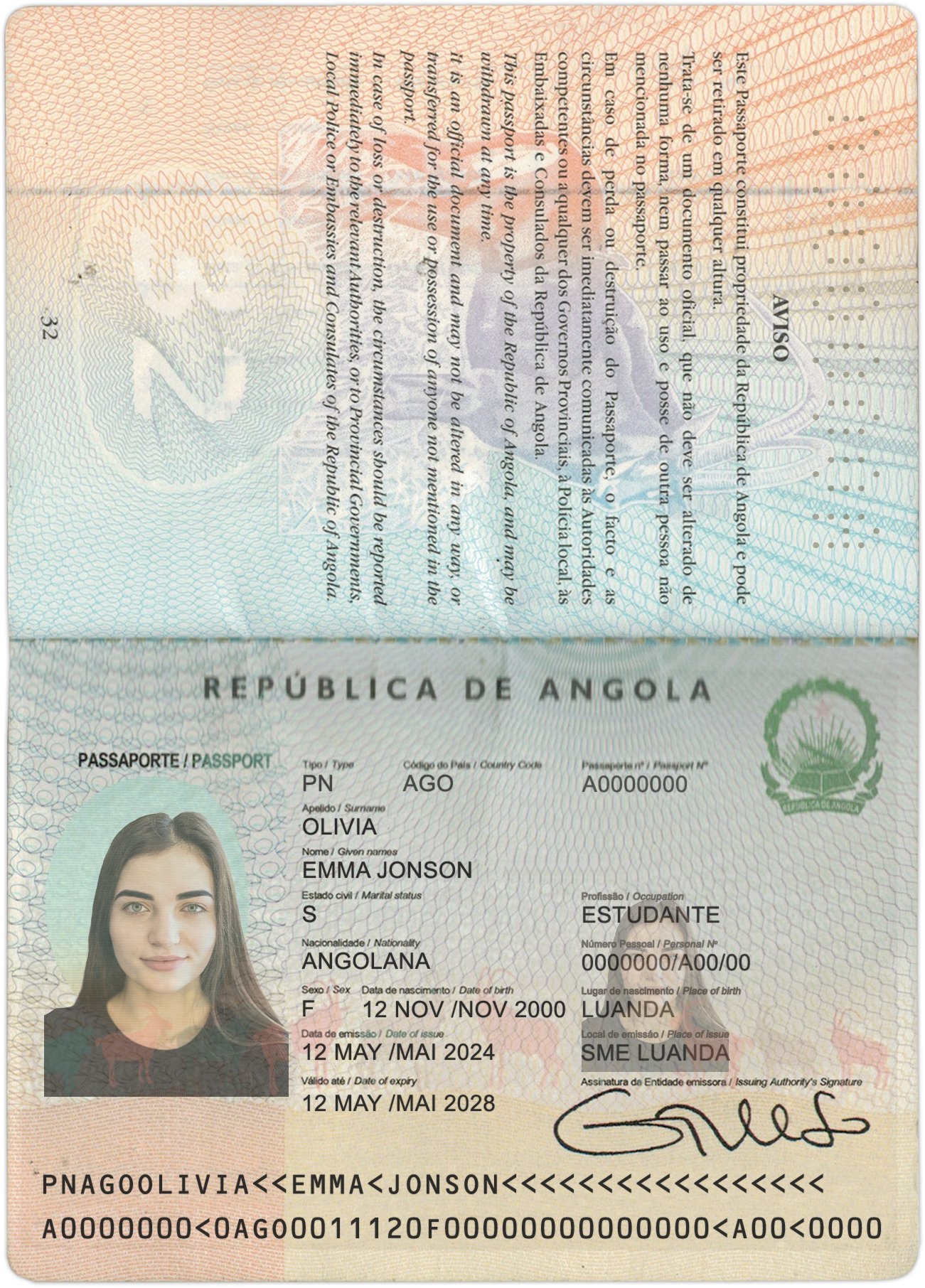 - ✅ Official design — Based on the Angola passport format (Version 1)