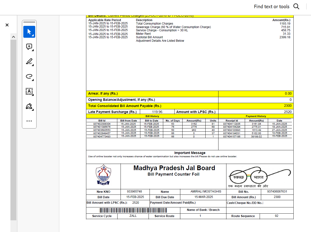🖼️ India Madhya Pradesh Jal Board Water Bill PDF Template Preview: