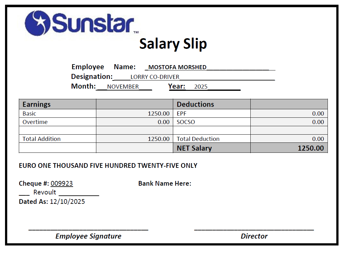 πΌοΈ Sunstar Lorry Driver Salary Slip Template Preview: